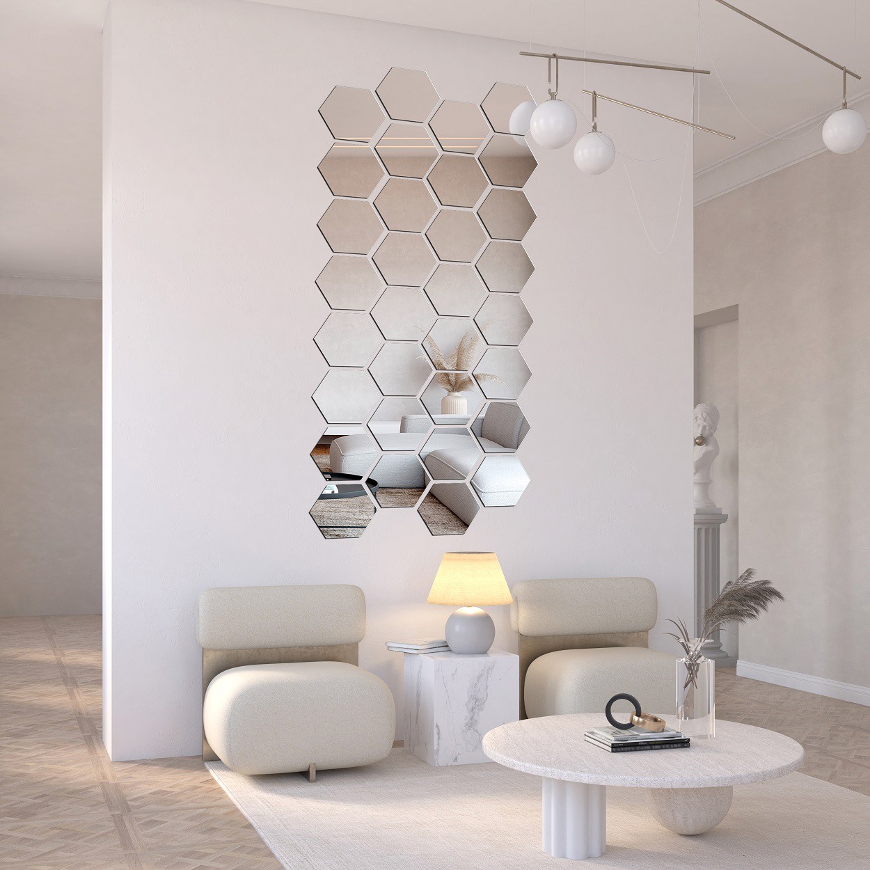 • Salon: Si nous avons une cheminée, créer une mosaïque miroir au-dessus peut s’avérer une excellente décoration qui deviendra le point central du salon. Une telle composition confère à l’intérieur du luxe et de l’élégance. De plus, si le salon comporte des colonnes, des piliers ou d’autres éléments architecturaux, il vaut la peine de les habiller de carreaux miroir afin d’apporter luminosité et modernité au salon.