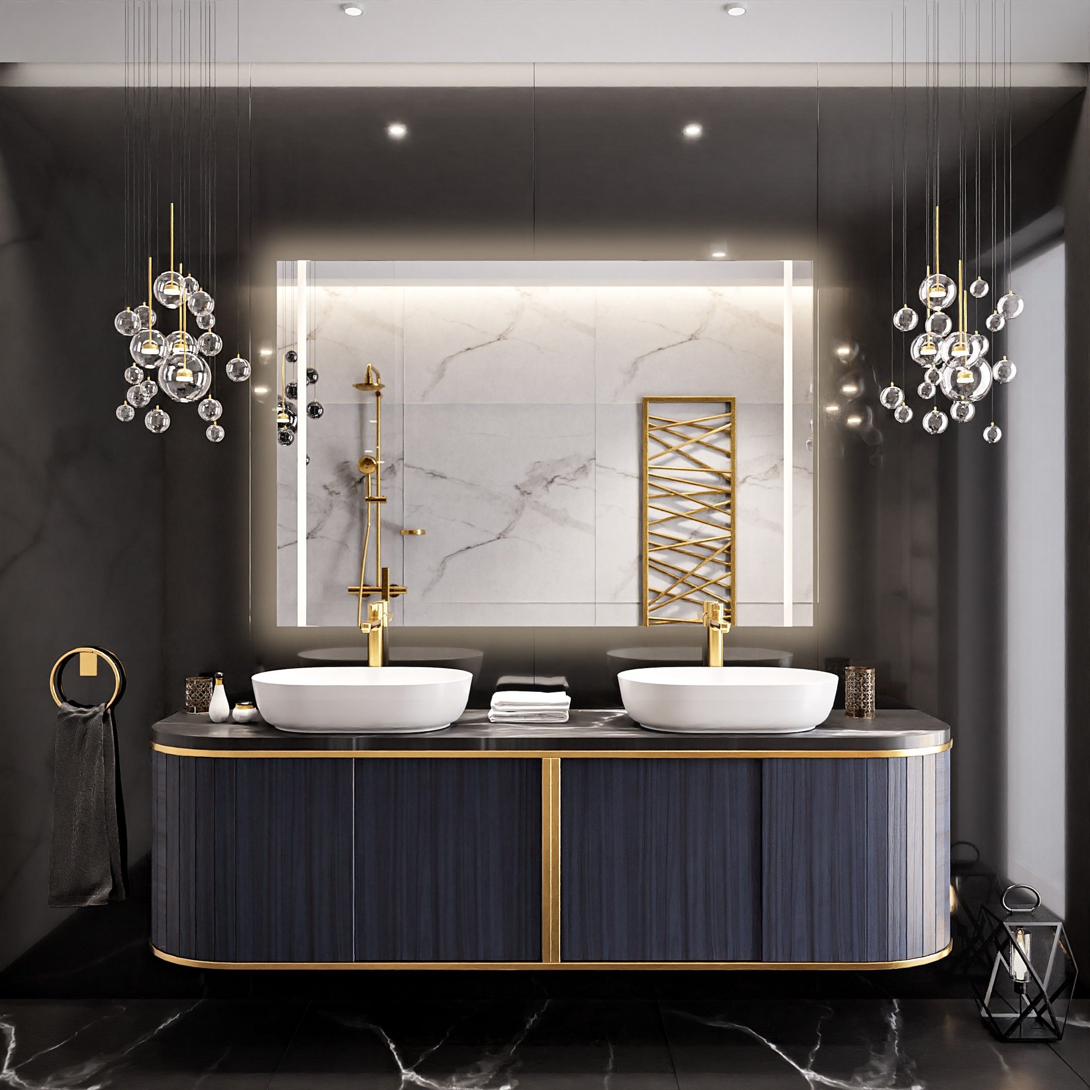 - Un éclairage intégré au miroir – c’est la solution la plus simple et la plus élégante, car elle ne nécessite pas d’éléments ni de câbles supplémentaires. L’éclairage intégré au miroir utilise généralement des diodes LED, qui sont économes en énergie, durables et offrent une lumière vive et uniforme. Ce type d’éclairage est idéal pour les petites salles de bains modernes.