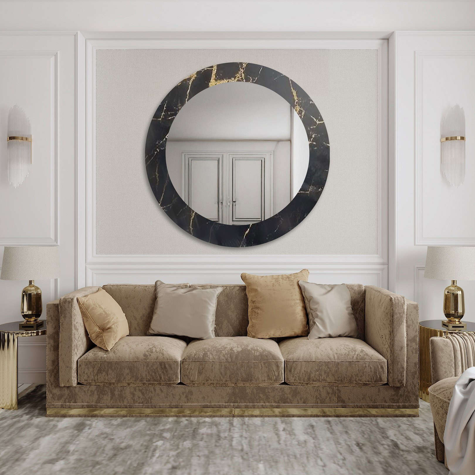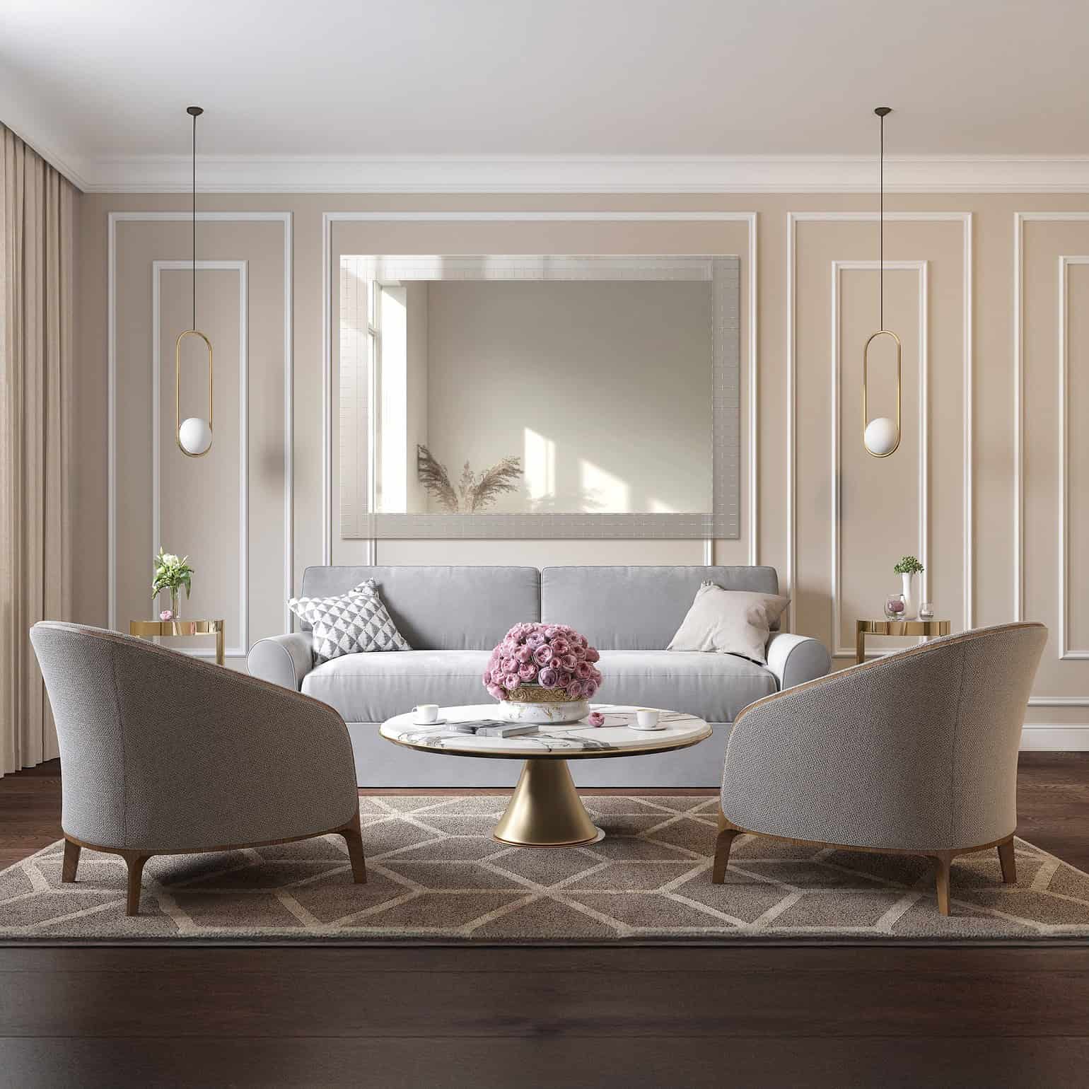 Le choix du miroir pour le salon doit être réfléchi en fonction de l’harmonie avec les autres éléments de décoration. Le miroir doit être en accord avec le mobilier de style Art déco – comme les canapés en velours ou les fauteuils aux formes simples. Il est également souhaitable qu’il soit en accord avec les accessoires – lustres et lampes – qui soulignent le style de la pièce. Cette approche apporte au salon non seulement de la fonctionnalité, mais aussi une attractivité visuelle.